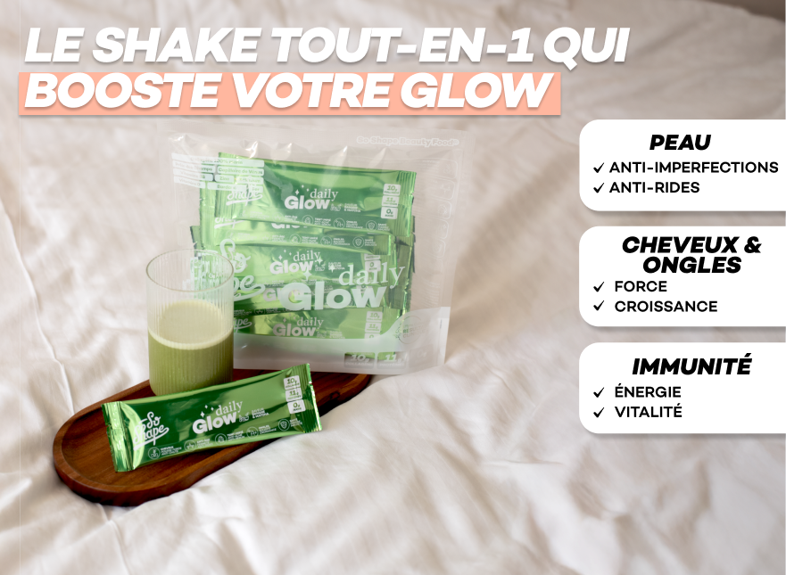 Daily Glow, c’est une cure tout-en-1 qui agit à la fois sur votre éclat, sur votre immunité et sur votre énergie. Avec 10 g de collagène marin, 11 g de protéines, et un concentré d’actifs ciblés, sa formule est hautement assimilée par votre corps et vous offre donc des résultats visibles et durables grâce à un geste simple.